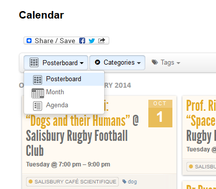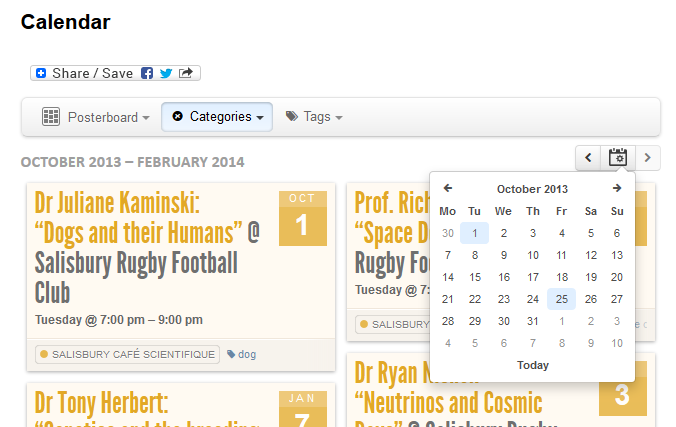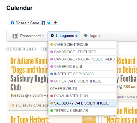 The calendar has a default view of Posterboard with a Category filter on to show only Salisbury Cafe Scientifique events.