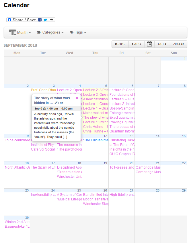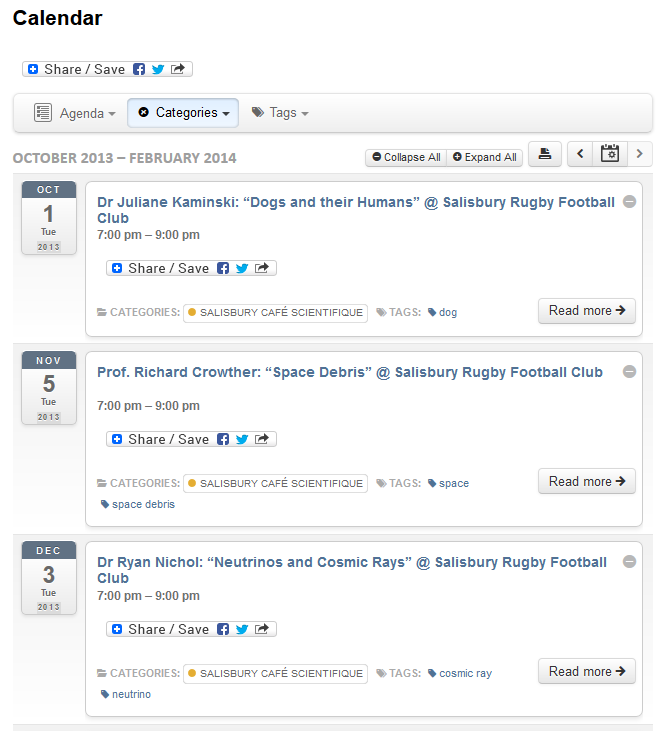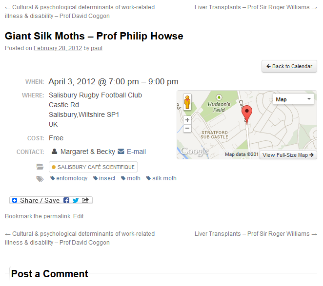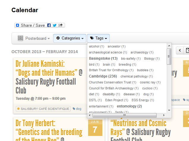 The calendar includes not only the Salisbury Cafe Scientifique events but a whole range of accessible events from other organisations including other local Cafe Scientifique branches, universities and science institutions. That means at any one time there may be hundreds of science events you may be interested in from a whole range of sources!
