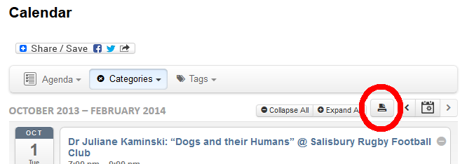 Simply choose Agenda view, then optionally apply or remove any Filters you wish and use the Print button as shown above. Other views can also be printed from most modern web browsers.